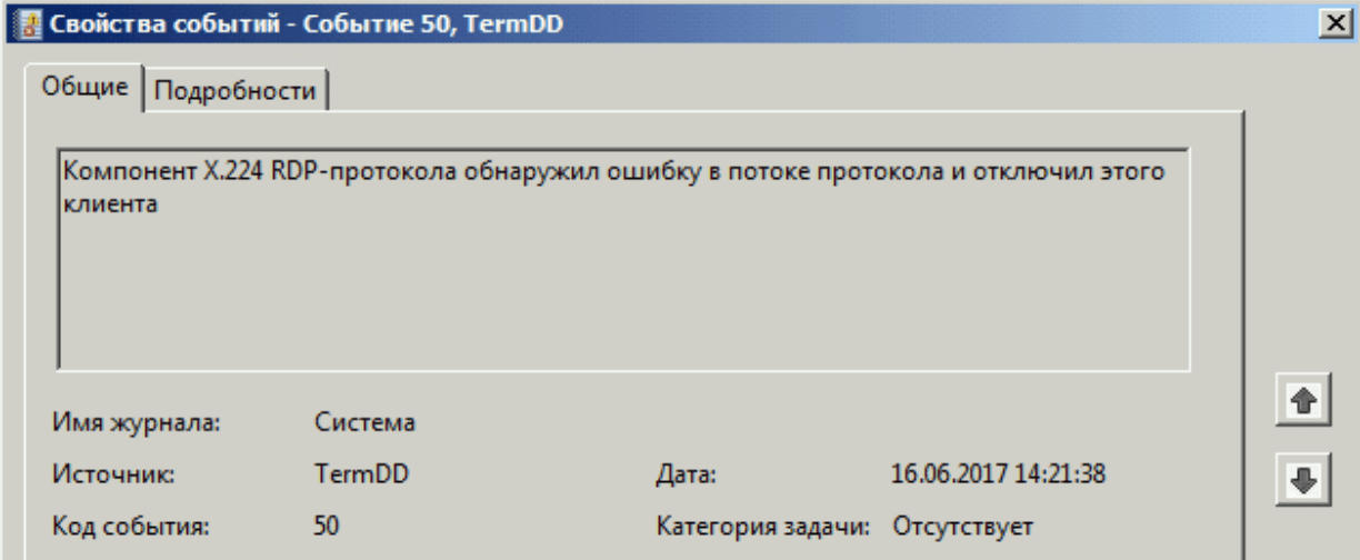Компонент X.224 RDP-протокола обнаружил ошибку в потоке протокола и отключил этого клиента.