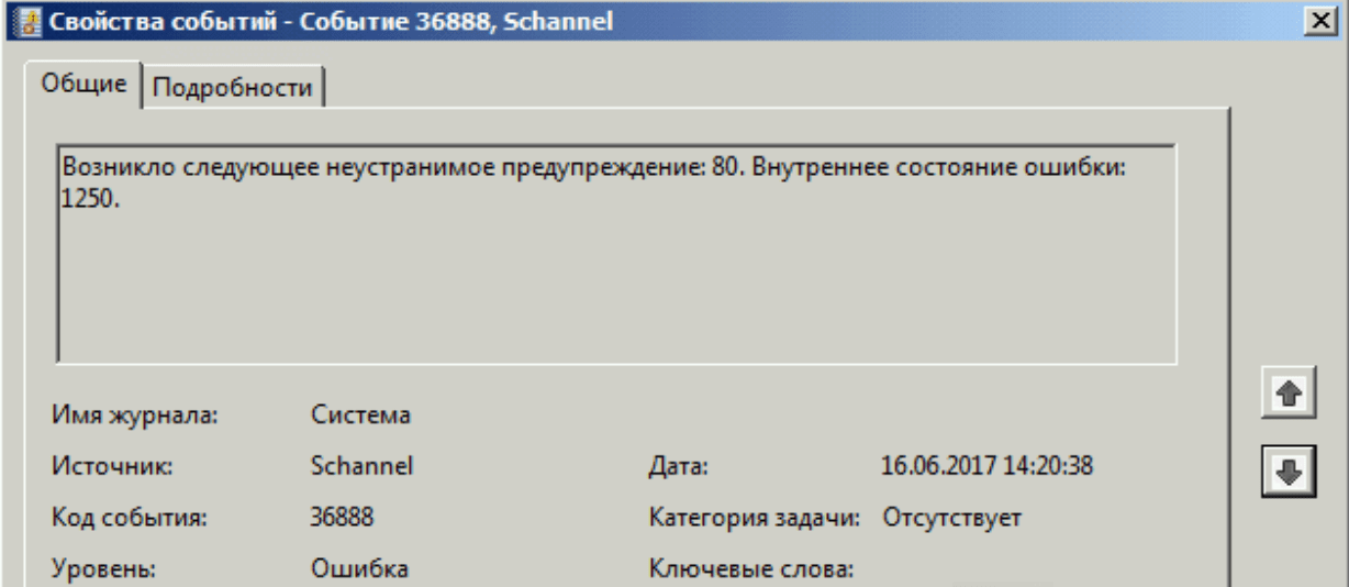 Если начать просматривать логи Windows, то можно увидеть следующее системное предупреждение: «Возникло следующее неустранимое предупреждение: 80 (или 36888). Внутренне состояние ошибки: 1250.»