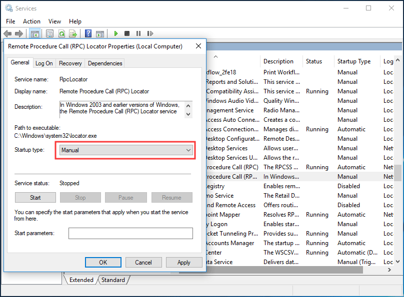- Удаленный вызов процедур (RPC) — тип запуска «Автоматически».