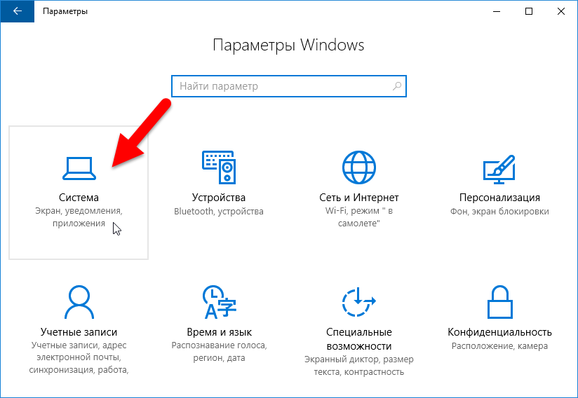 В открывшемся окне приложения «Параметры Windows» выберите раздел «Система»