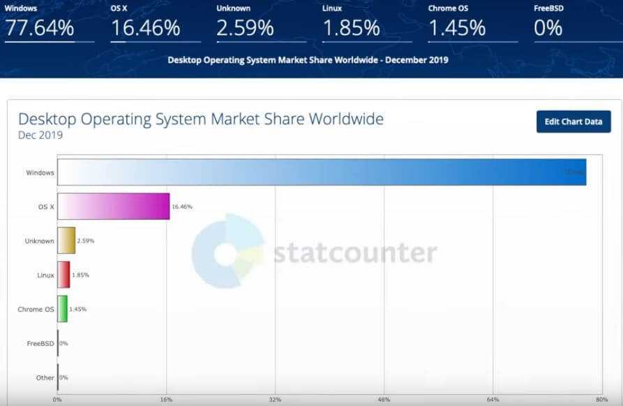 На первом месте идет винда с большим отрывом далее linux и замыкает mac os аж с двух кратным отставанием.