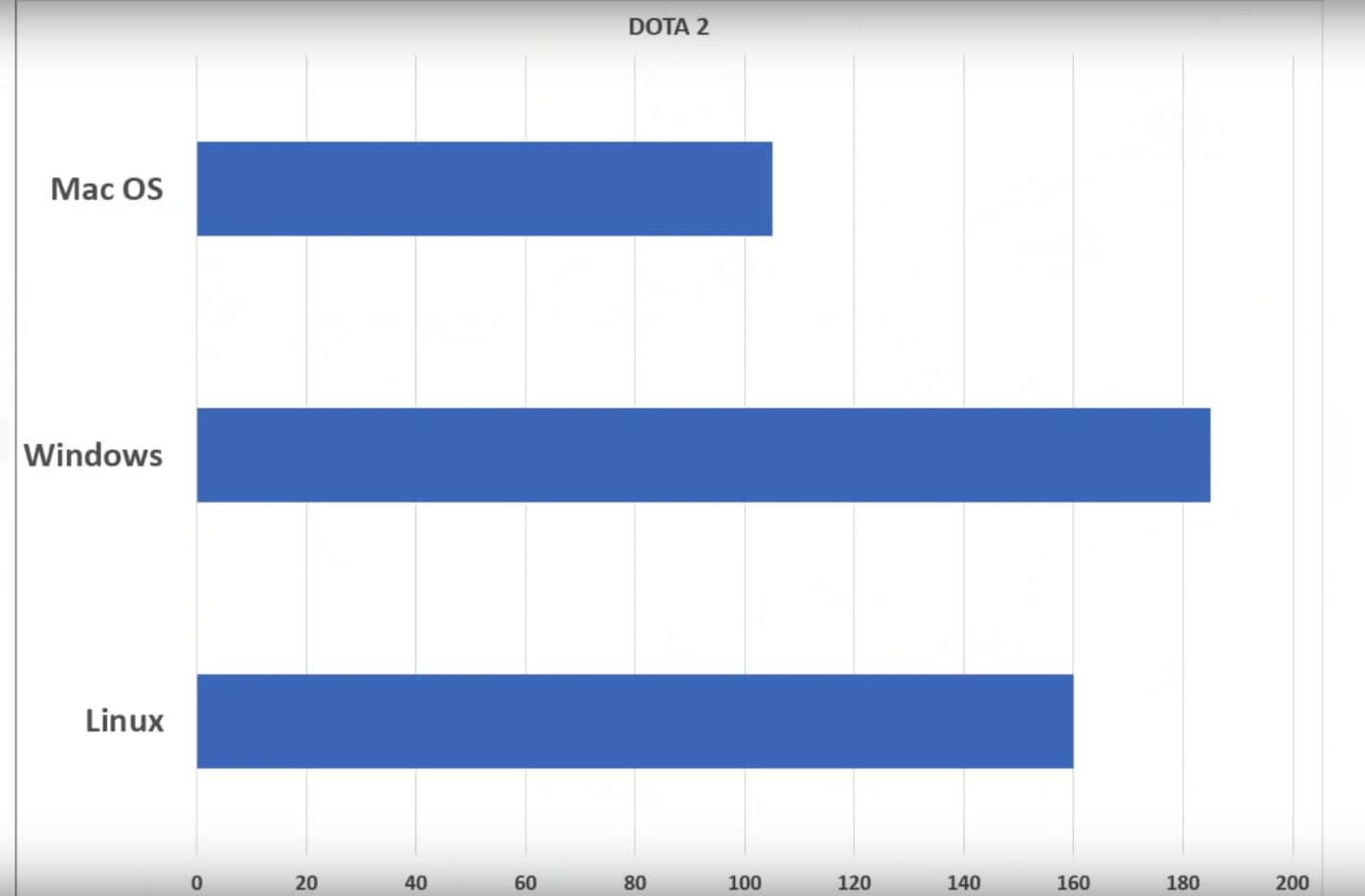 Dota 2 максимальные настройки и аналогичная картина, что интересно вырвавшуюся винду понять можно ведь при тестах использовался api directx но linux с mac os используйте OpenGL и если в синтетике разница незначительна то в играх она огромна. Та же самая картина в counter-strike хотя есть проекты где mac os выигрывает у linux, например, в War Thunder тест open gl на трех системах с максимальными настройками.