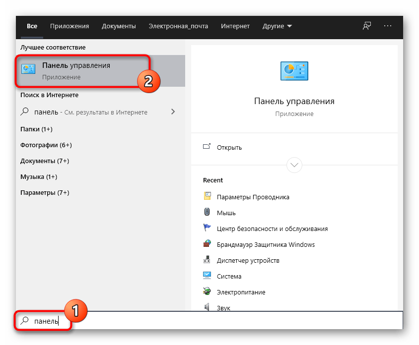 - Откройте «Пуск» и через поиск отыщите «Панель управления».