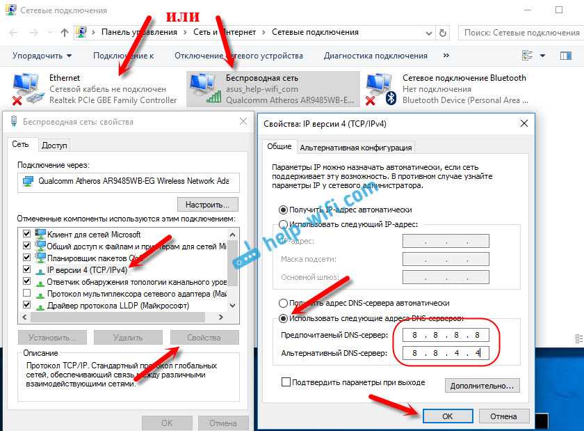 Нажимаем правой кнопкой на тот адаптер, через который у вас подключен интернет, и выбираем «Свойства». Выделяем «IP версии 4 (TCP/IPv4)», и нажимаем на кнопку «Свойства». В новом окне ставим переключатель возле «Использовать следующие адреса DNS-адресов», и прописываем такие адреса: