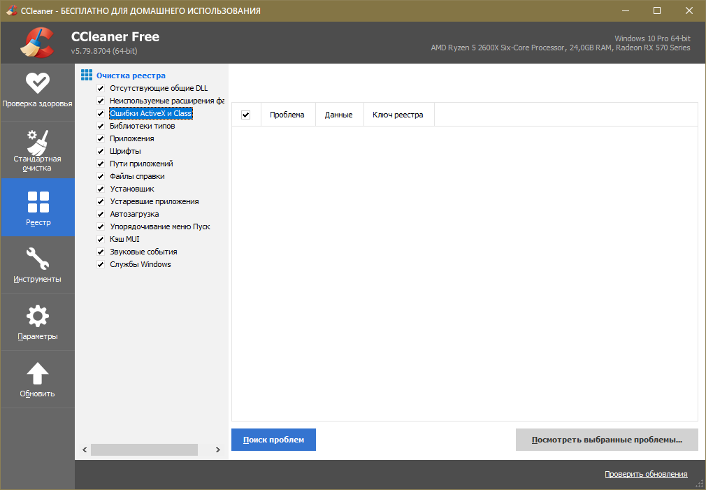- Требуется кликнуть по вкладке «Реестр». Среди пунктов проверки (расположены в левой части окна) необходимо в обязательном порядке поставить галочку напротив ошибок ActiveX.