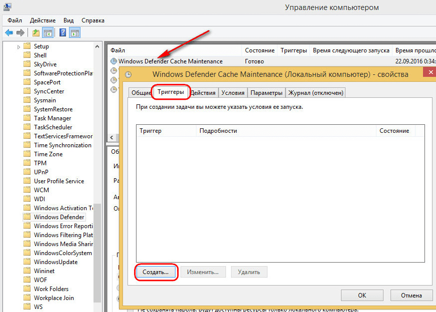 Во вкладке «Триггеры» окошка задач Защитника можно нажать кнопку внизу «Создать»,