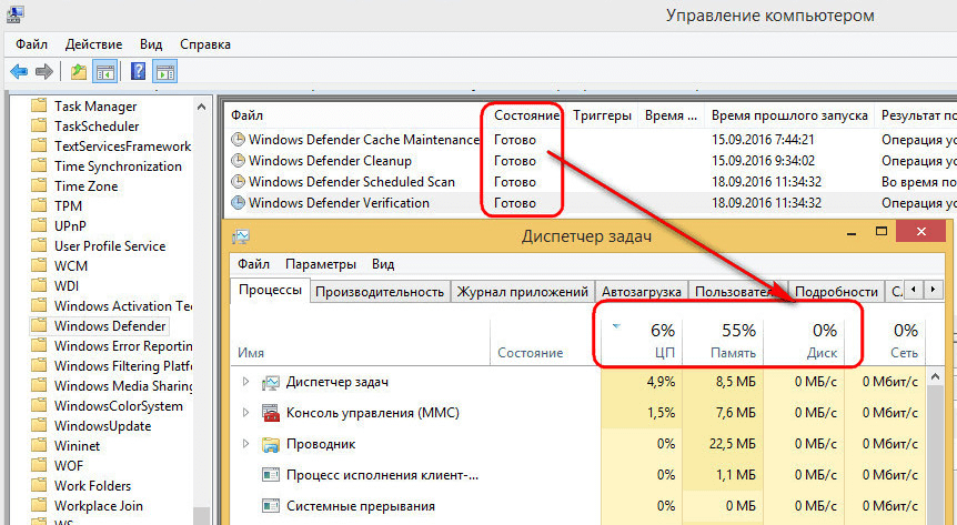 скрин ниже, кстати, напротив них будет отображаться время последнего их запуска, которое еще раз покажет вам, что защитник нагружал ЦП…).