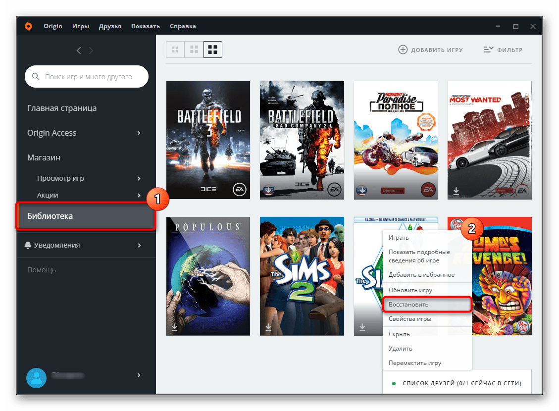 - Переместитесь в «Библиотеку» клиента и отыщите там плитку с игрой. ПКМ по ней вызовет контекстное меню, из которого следует выбрать «Восстановить».
