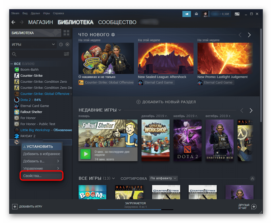 - В «Библиотеке» найдите игру, которую не удается запустить, и нажмите по ней правой кнопкой мыши. Из меню выберите «Свойства».