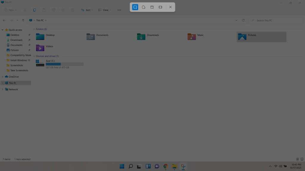 - После настройки параметров используйте кнопку «Создать», чтобы начать создание снимка экрана. В зависимости от того, какую задержку вы установили, экран погаснет либо сразу, либо через несколько секунд. Эффект идентичен тому, что вы получаете, используя сочетание клавиш, поэтому метод должен быть вам знаком. Вы можете изменить форму выделения с помощью кнопок на верхней панели.