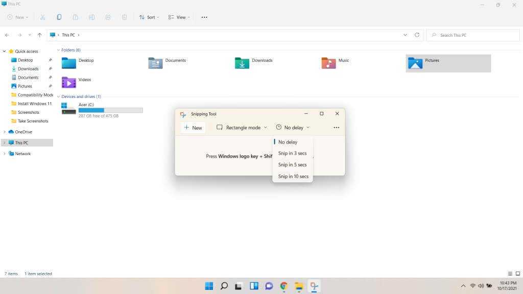 - Третий и самый мощный вариант — установить задержку. С помощью этой опции можно настроить скриншоты на несколько секунд вперед. Это может позволить вам делать фрагменты таких вещей, как раскрывающиеся меню или выделенные записи, что в противном случае невозможно. И, в отличие от ярлыка, вы также можете сохранить эти фрагменты с произвольными именами.