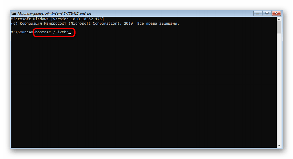 В строке введите команду bootrec /FixMbr и нажмите на Enter.