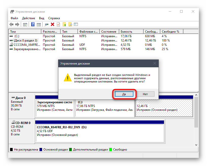 Как видите, появилось уведомление о том, что данный раздел не был создан Windows, соответственно, принадлежит он файловой системе Linux. Подтвердите удаление и выполните то же самое с оставшимися разделами.