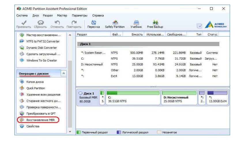 Также удаление линукс из-под Windows представляется возможным с помощью программы AOMEI. Все необходимые инструменты для удаления разделов Linux есть в бесплатной редакции программы Standard Edition. После установки сторонней программы с официального сайта разработчиков нужно ее запустить и на боковой панели в разделе «Операции с диском» выбрать «Восстановление МВR».