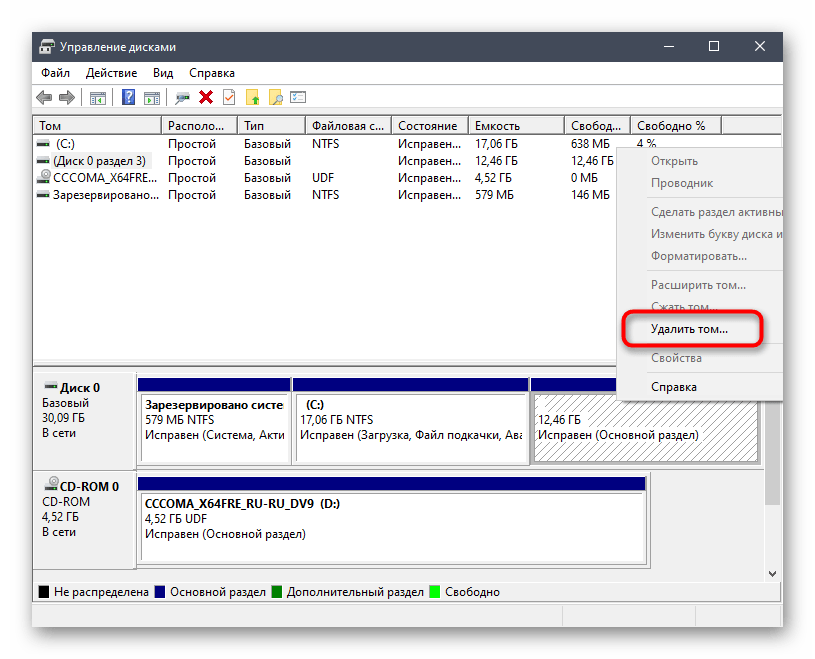 Нажмите по разделу правой кнопкой мыши и выберите пункт «Удалить том».
