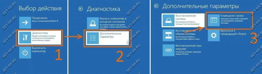 На стадии начала установки нужно нажать на ссылку «Восстановление системы». Как только появится синее окно с выбором действия — выберите: «Диагностика»-«Дополнительные параметры»-«Командная строка».