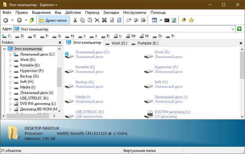 Бесплатная портативная программа Explorer++ — это достаточно простенький сторонний проводник в стиле старых версий Windows с возможностью работы в нескольких вкладках. Реализует привычные функции штатного проводника Windows, а кроме них: