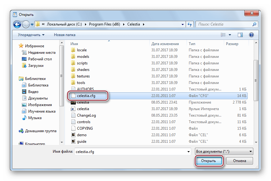 Открывается окно Проводника, в котором перемещаемся в директорию с «celestia.cfg» и меняем отображение на «Все файлы», чтобы его было видно. После чего нажимаем по нему и кликаем «Открыть».