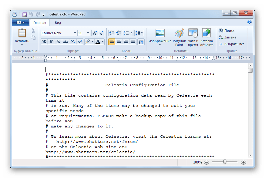 NotePad – многофункциональный редактор с поддержкой множества текстовых форматов. Рассмотрим процесс открытия в нем CFG на примере файла конфигурации «celestia.cfg», взятого из известного симулятора космоса Celestia.