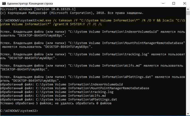 cmd.exe/c takeown/f "C: \ System Volume Information \ *"/R/DY && icacls "C: \ System Volume Information \ *"/grant: R СИСТЕМА: F/T/C/L