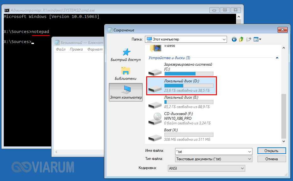 Если удалить пакеты обновлений приведёнными выше способами не удалось, можно применить более эффективный, но и в то же время более сложный метод. Загрузитесь с установочного диска в среду восстановления, откройте командную строку и определите для начала букву системного диска. Проще всего это сделать, выполнив команду notepad, а затем выбрав в меню открывшегося блокнота опцию «Сохранить как».