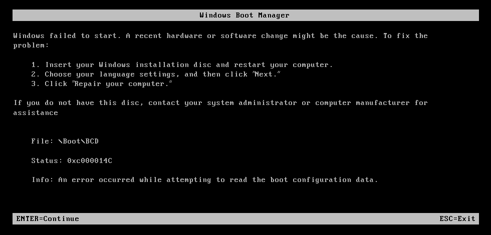 Windows failed to start. A recent hardware or software change might be the cause. To fix the problem: 1. Insert your Windows installation disc and restart your computer. 2. Choose your language settings, and then click "Next." 3. Click "Repair your computer." If you do not have this disc, contact your system administrator or computer manufacturer for assistance File: \Boot\BCD Status: 0xc000014C Info: An error occurred while attempting to read the boot configuration data.