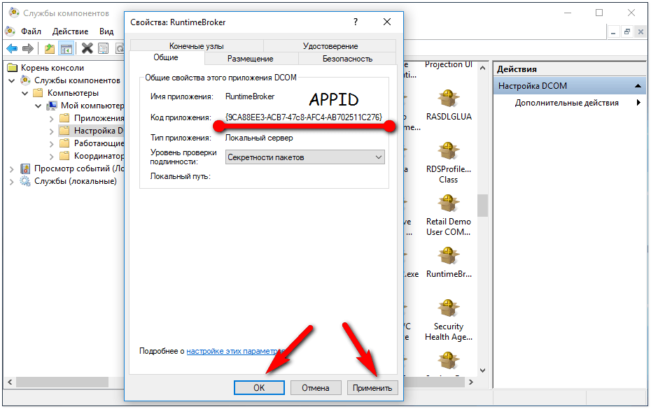 - Во вкладке «Общие» у вас будет «Код приложения» запомните его на двух файлах RuntimeBroker.