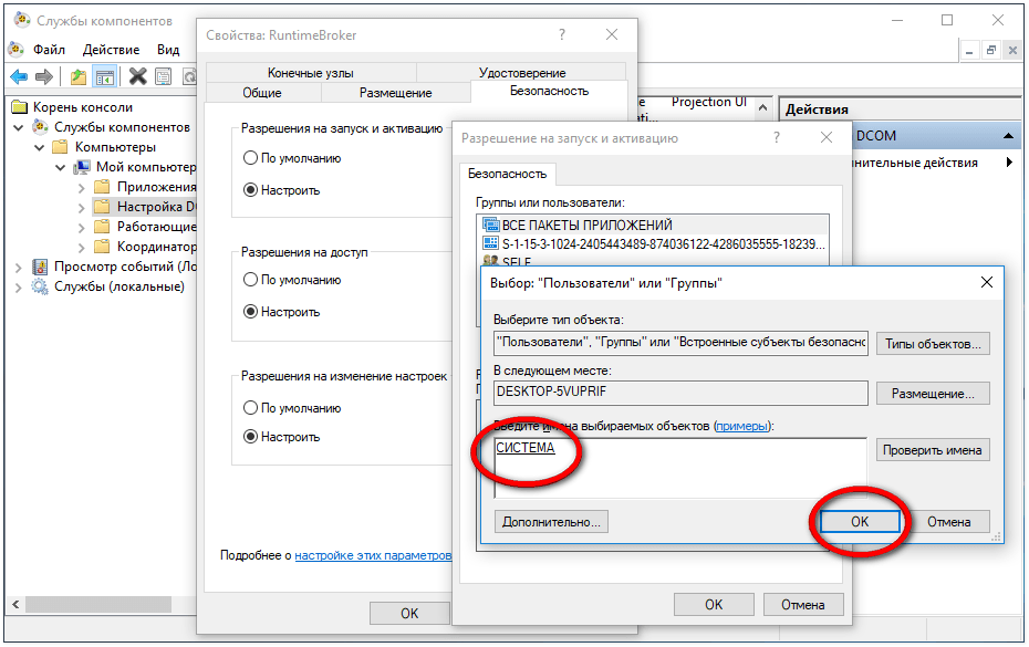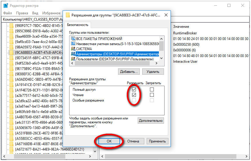 Проделайте с ним те же манипуляции по замене владельца на Администраторы с предоставлением полных разрешений. Половина дела сделано, осталось только изменить разрешения для самого COM-объекта. Которым, как уже было определено, является RuntimeBroker.