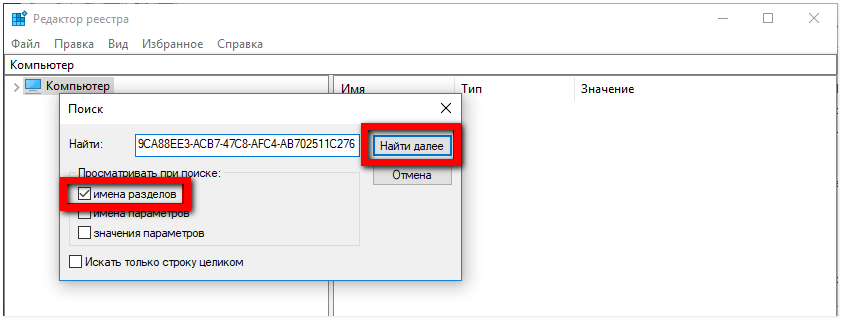 - Введите в поле поиска свой CLSID ключ, который типа {D63B10C5… . Поставьте галочку искать только «имена разделов».