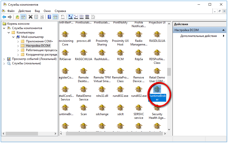Перейдите по следующему пути Службы компонентов > Компьютеры > Мой компьютер > Настройка DCOM > и найдите в списке RuntimeBroker.