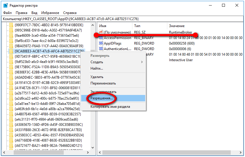 У меня это COM — объект RuntimeBroker. У Вас это может быть другое приложение. Нажмите по найденному разделу ПКМ, выберите в меню «Разрешения».