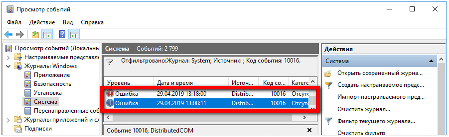 Ошибка DistributedCOM 10016 в Windows 10 — это системное событие, поэтому находится она в пункте «Система» раздела «Журналы Windows» в меню слева. Справа расположен список событий, в котором и можно найти ошибку — она помечена красной иконкой с восклицательным знаком. В верхнем окне справа отмечается основная информация о событии — точное время, код и источник. В нижнем окне служба показывает всю информацию об ошибке, которой достаточно для ее решения, но разобраться в этих данных может быть сложно для начинающего пользователя.