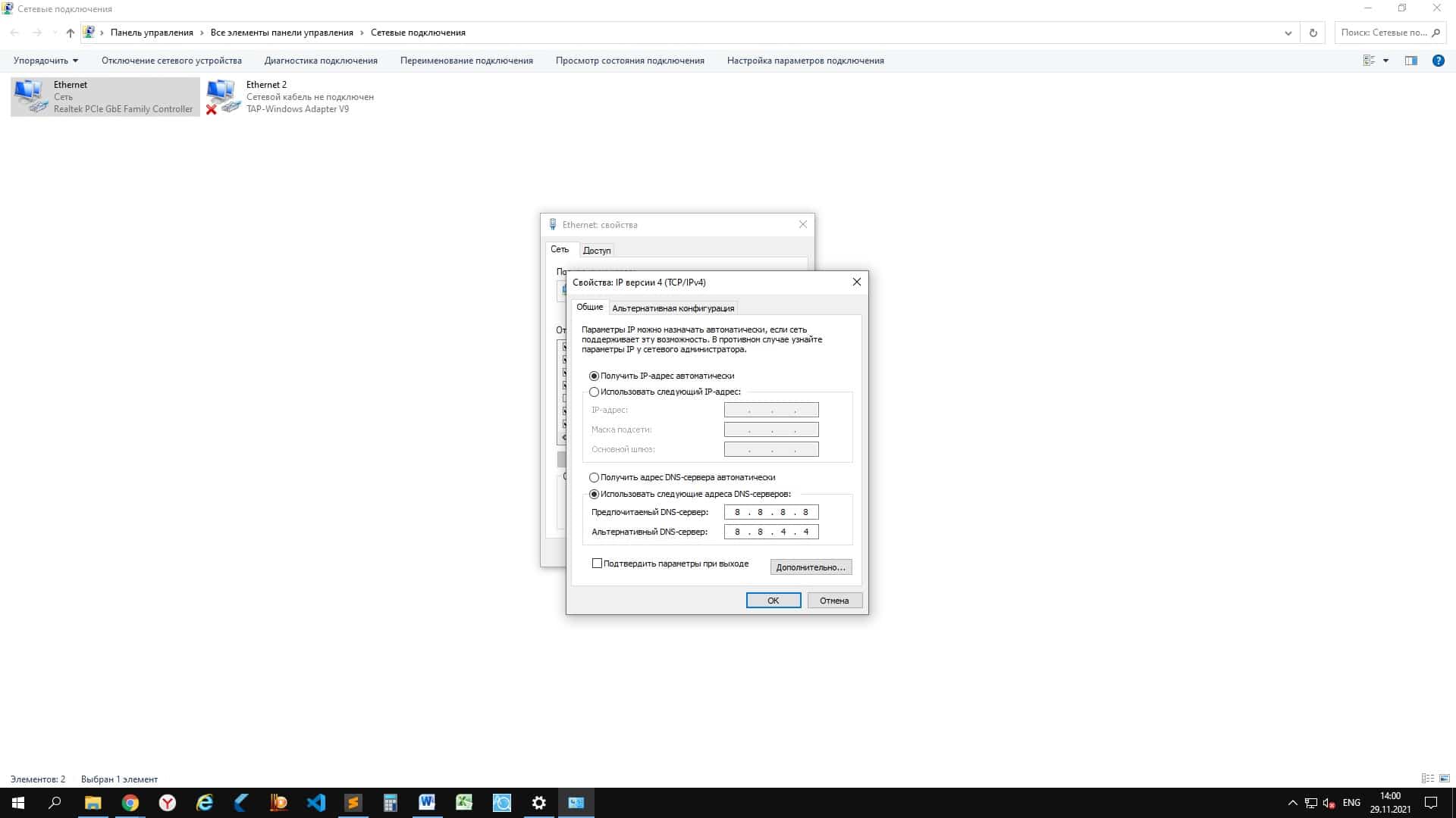 - Далее задайте публичный DNS-адрес от Google 8.8.8.8 — 8.8.4.4, нажав «Использовать следующие адреса…».