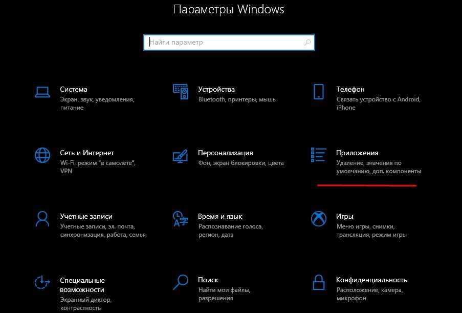 Для восстановления работы операционной системы необходимо через главное меню зайти в раздел «Параметры» и открыть «Приложения».