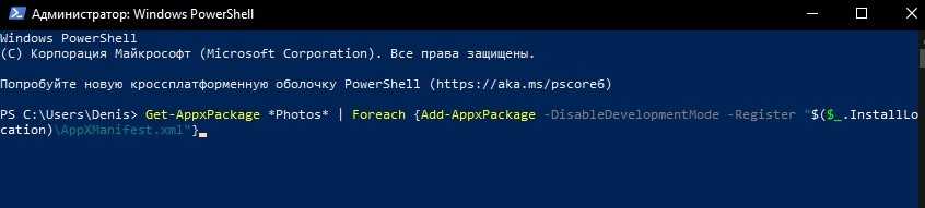 Для переустановки проблемного приложения необходимо запустить от имени Администратора PowerShell. Затем в новом окне нужно написать команду Get-AppxPackage *Photos* | Foreach {Add-AppxPackage -DisableDevelopmentMode -Register «$($_.InstallLocation)\AppXManifest.xml»}.