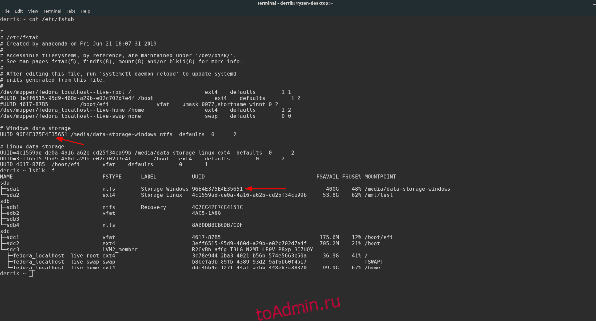 Примечание: не можете найти раздел жесткого диска, который хотите изменить, в файле Fstab? Откройте второй терминал, запустите lsblk -f и сравните код UUID, который появляется рядом с разделом, который вы хотите редактировать в выводе lsblk, с кодом в «/ etc / fstab».