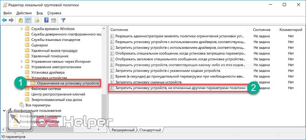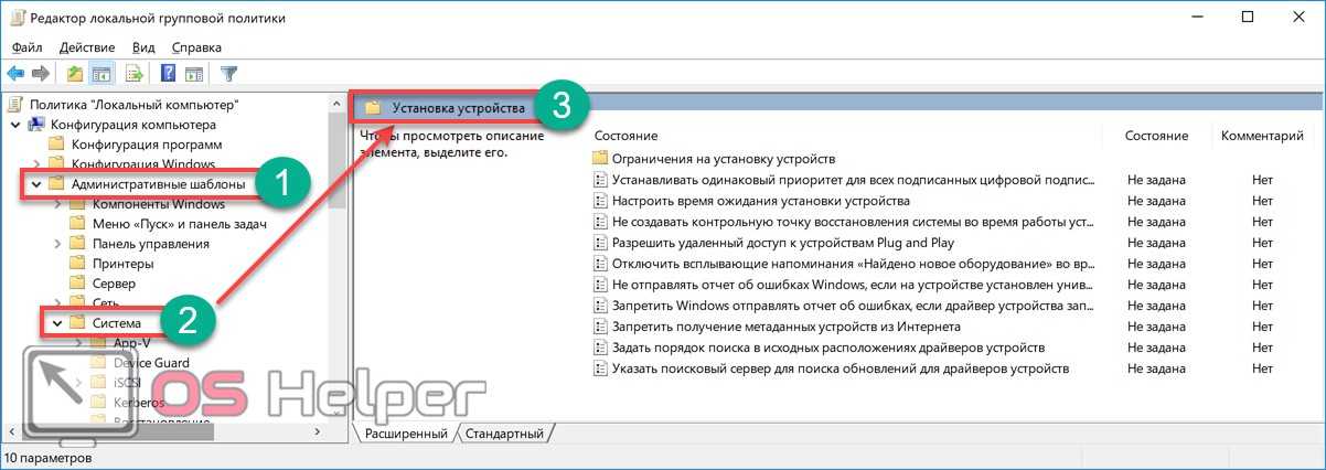 - Откроется редактор групповых политик Windows. Последовательно разворачиваем обозначенные цифрами «1» и «2» ветки. В группе параметров «Система» находим блок «Установка устройства».