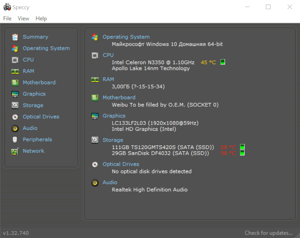 Начинать всегда следует с перегрева. Узнать, какая температура считается нормальной для устройства, несложно — это указано в спецификации; достаточно просто забить запрос в любой поисковик. Реальные температурные показатели оборудования я проверяю с помощью бесплатной утилиты Speccy.