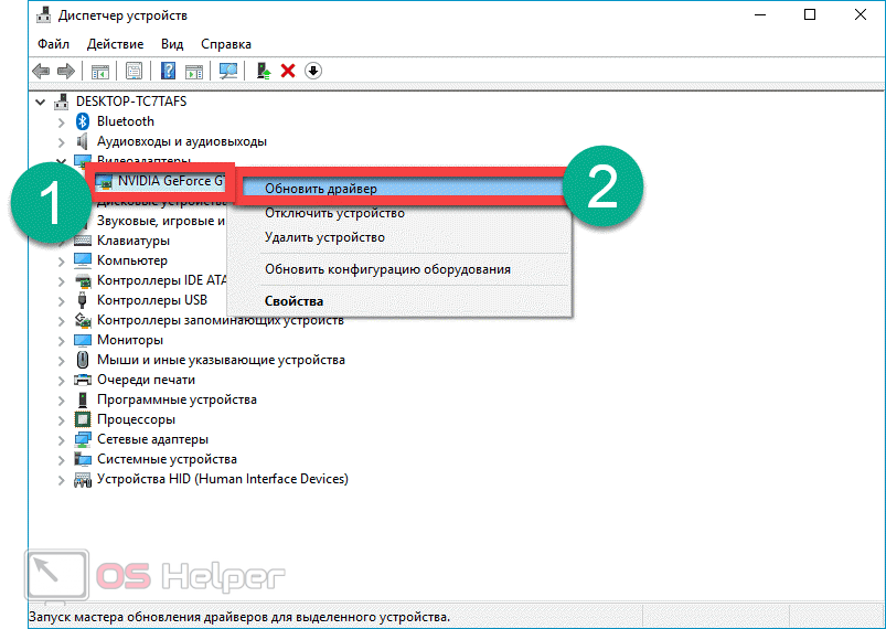 - Откройте «Диспетчер устройств», кликните правой кнопкой по видеокарте, перейдите в «Свойства».