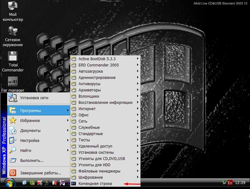 Загружаемся с нашего Live CD или USB. Заходим, пуск > программы > командная строка.