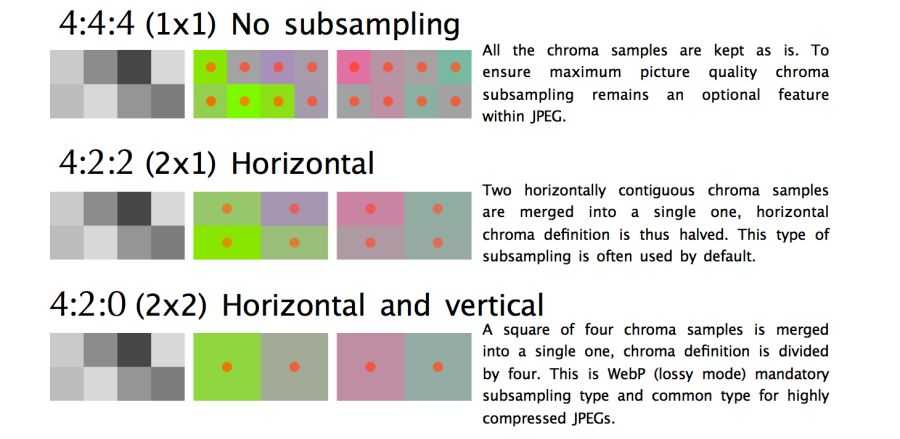JPEG поддерживает различные типы подвыборки: отсутствие подвыборки, горизонтальная, горизонтальная+вертикальная. Здесь иллюстрация из статьи «JPEG для крабов» Фредерика Кайзера