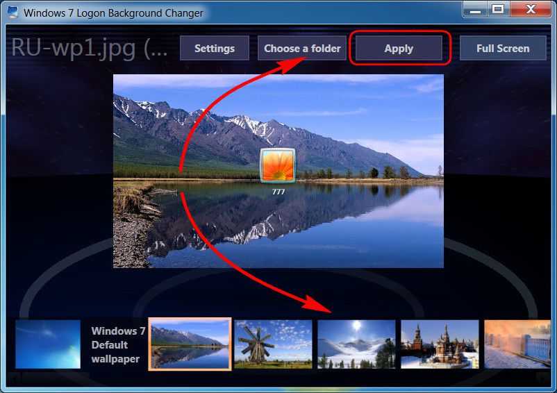 Это простейшая программка, выполненная в виде галереи изображений, которые могут быть применимы к экрану приветствия Windows 7. Картинки можно выбирать из тех, что предлагает сама утилита в ленте внизу. Также можно нажать опцию «Choose a folder», в проводнике указать своё хранилище фотоконтента и выбрать для фона что-нибудь из собственной коллекции. Определившись с выбором, жмём «Apply».