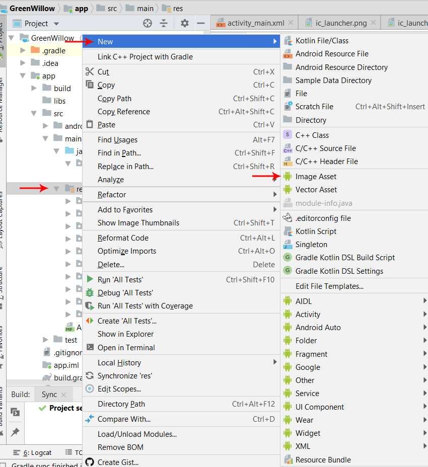 Для того чтобы добавить своё изображение в проект, в программе Android Studio, в каталоге Вашего проекта, найдите путь: app > src > res и вызовите контекстное меню (правой кнопкой мыши):
