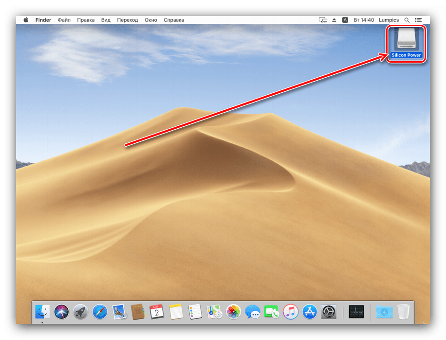 - Нужно подождать некоторое время, до минуты, пока флешка определится системой. По умолчанию в новейших версиях macOS (High Sierra и Mojave) на рабочем столе появится ярлык быстрого доступа к подключённому носителю – дважды кликните по нему для для просмотра содержимого.