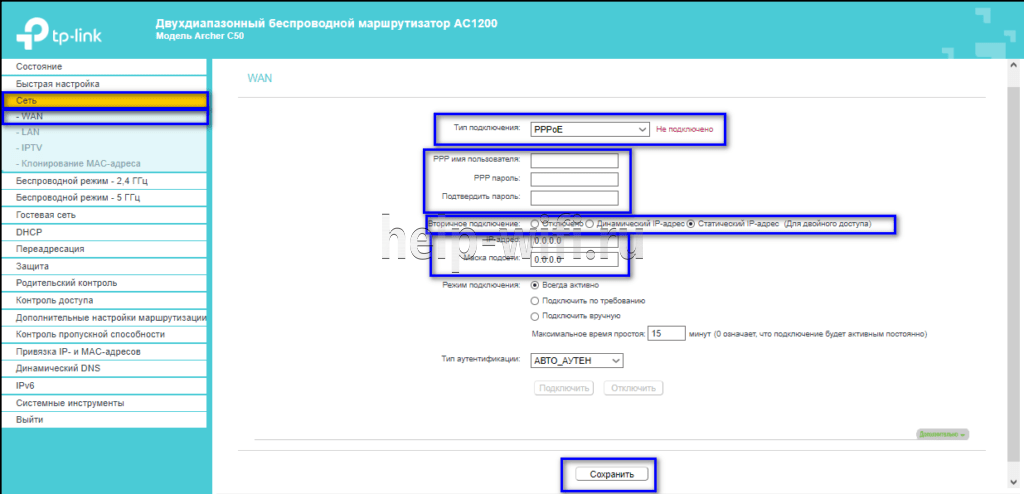 После того как вы зашли в интерфейс своего модема и получили доступ к настройкам, перейдите в раздел Сеть, далее перейдите в WAN, в этом разделе нужно будет осуществить настройку роутера, что такое WAN читайте здесь. Тип подключения выбираем «PPPoE/PPPoE Россия», в других маркам модема она может просто называться «PPPoE/PPPoE» или что-то похожее, но название PPPoE должно присутствовать в любом случае.