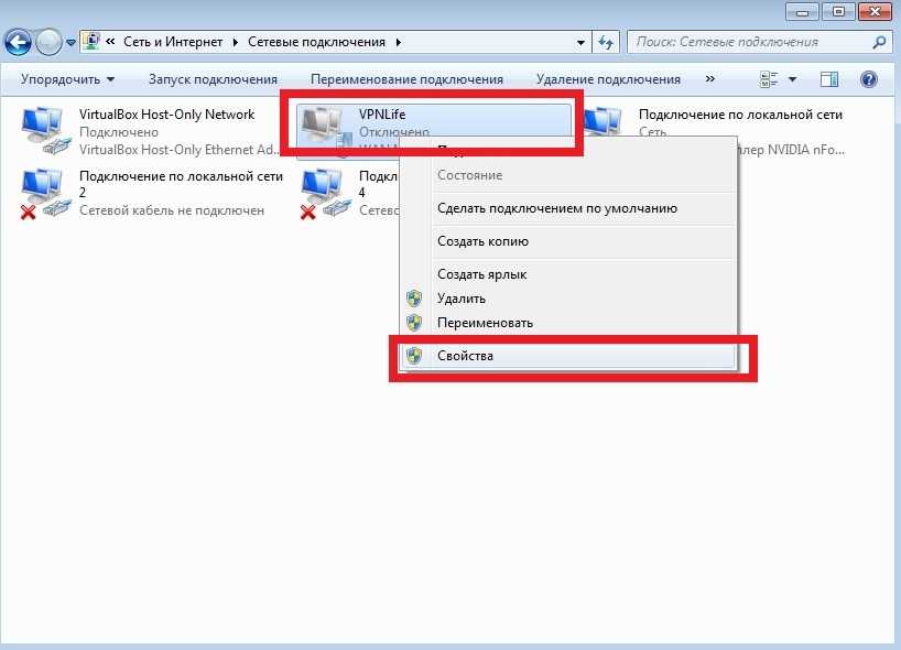Далее перейдите во вкладку Изменение параметров адаптеров, кликнете правой клавишей мыши по вашему VPN-соединению и выберите пункт Свойства: