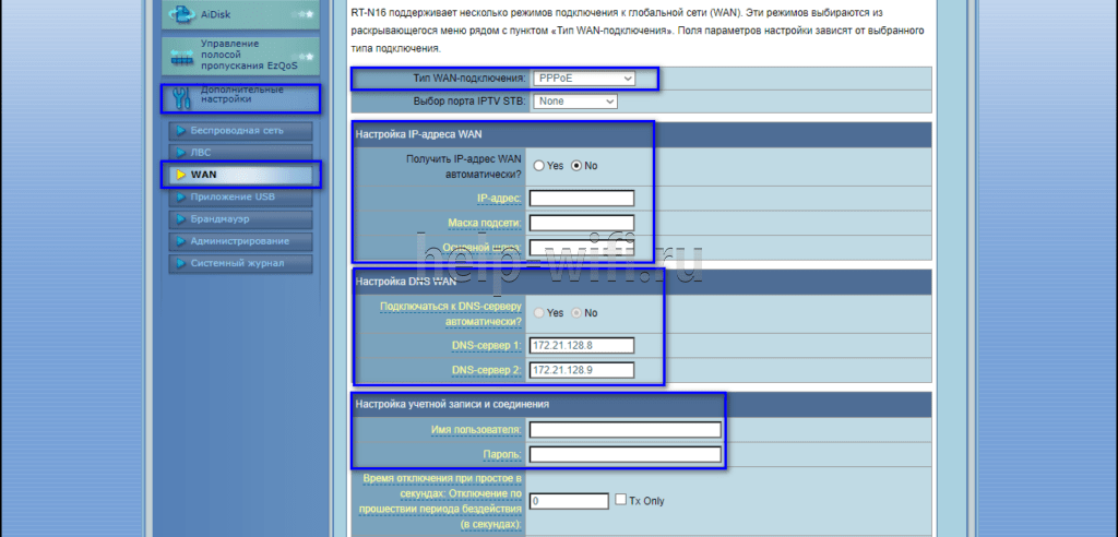 На экране появится меню быстрой настройки. Требуется закрыть его и перейти на главную страницу. Далее на роутерах с синим интерфейсом нажать «Дополнительные настройки» — «Wide Area Network, WAN) — компьютерная сеть, охватывающая большие территории и включающая большое число узлов, возможно находящиеся в различных городах и странах»>WAN-подключения» выбрать «
