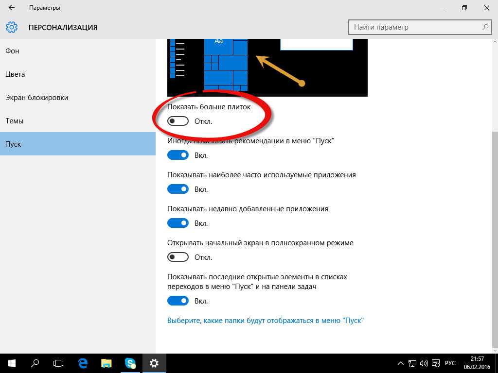 И так в пункте Пуск, вы можете увеличить количество плиток, обратите внимание на картинку со стрелкой, там показывается текущая область и снизу выключена галка Показать больше плиток, ее и нужно включить