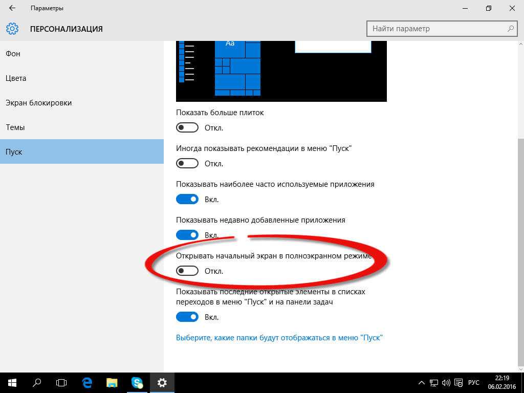 Если вам вдруг, как и мне нравится стиль метро и вас не напрягает при нажатии на пуск, появление экрана с кучей плиток на начальном экране, то в Windows 10, его так же можно вернуть, особенно удобно если у вас она стоит на планшете. Делается это просто, переключателем, все в той же персонализации, а именно Открыть начальный экран в полноэкранном режиме.
