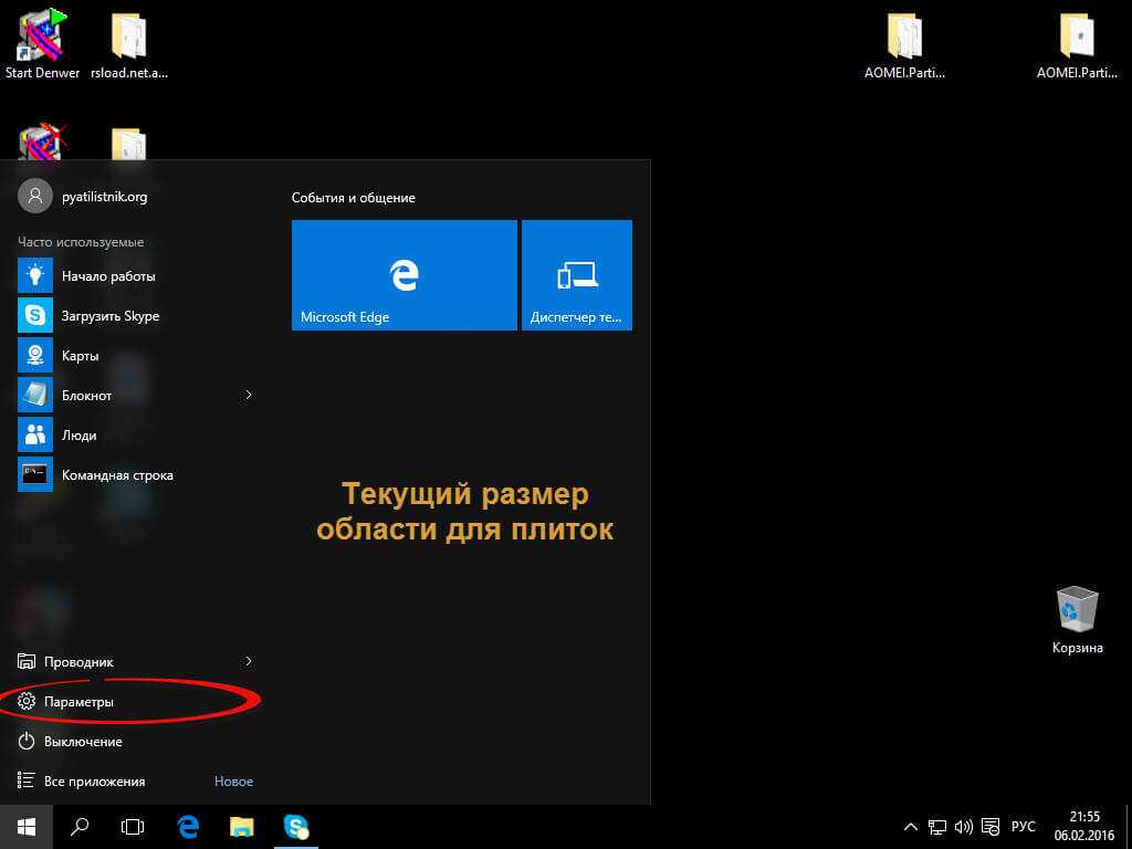 Обратите внимание на текущий размер области для плиток Windows 10, совсем маленький